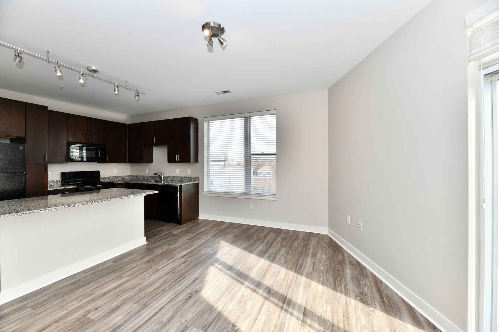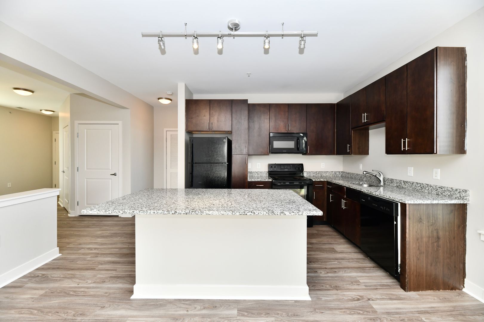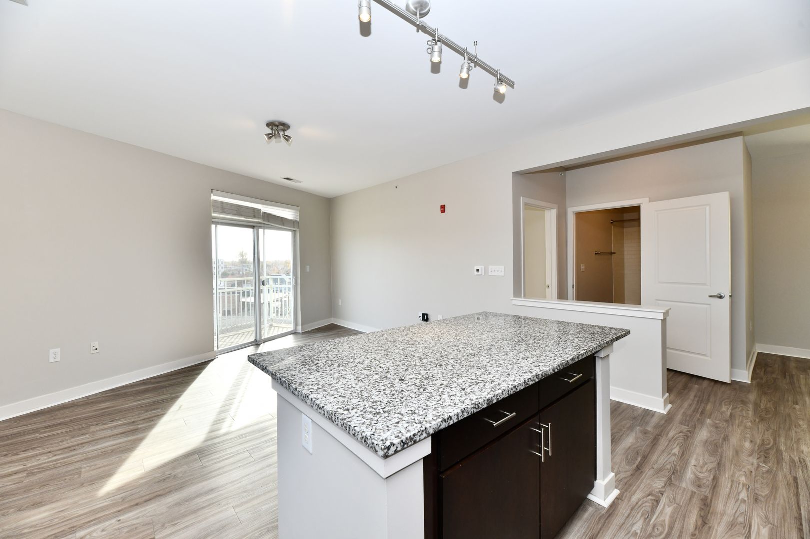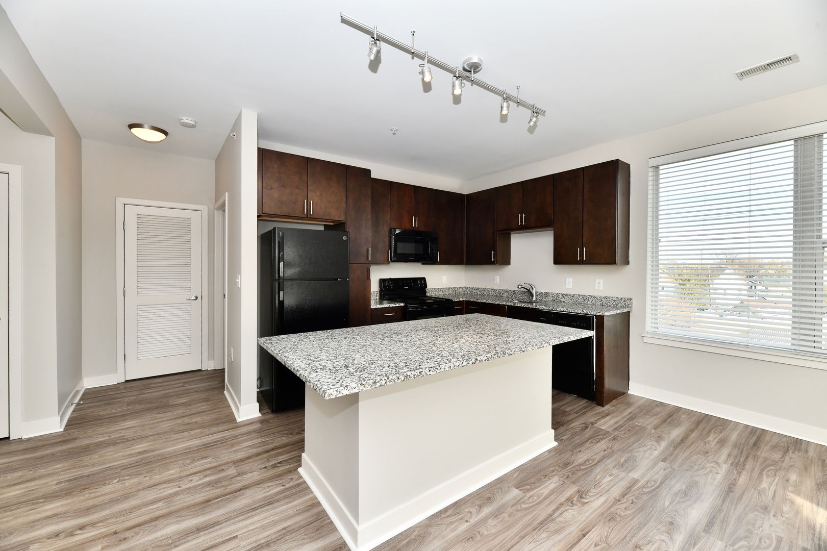 Inside, you’ll find an open-concept layout with large windows that flood the space with natural light. The modern kitchen features rich dark cabinetry, granite countertops, a spacious island ideal for entertaining, and sleek black appliances. Wood-style flooring throughout the main living area adds warmth and style, while the neutral color palette makes it easy to make the space your own.