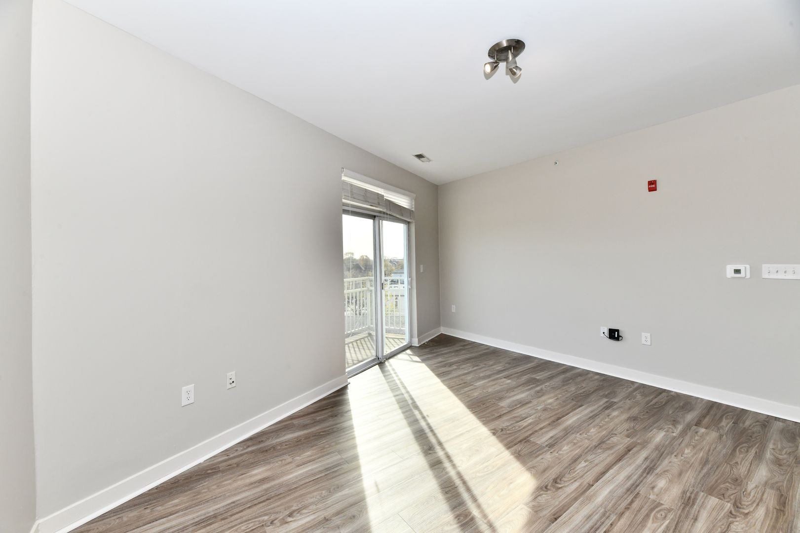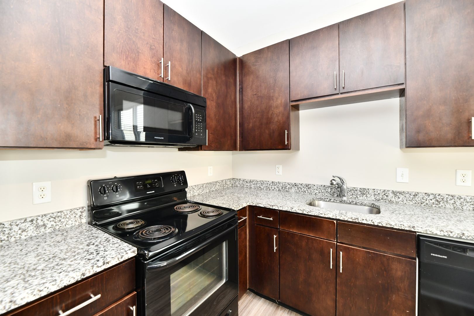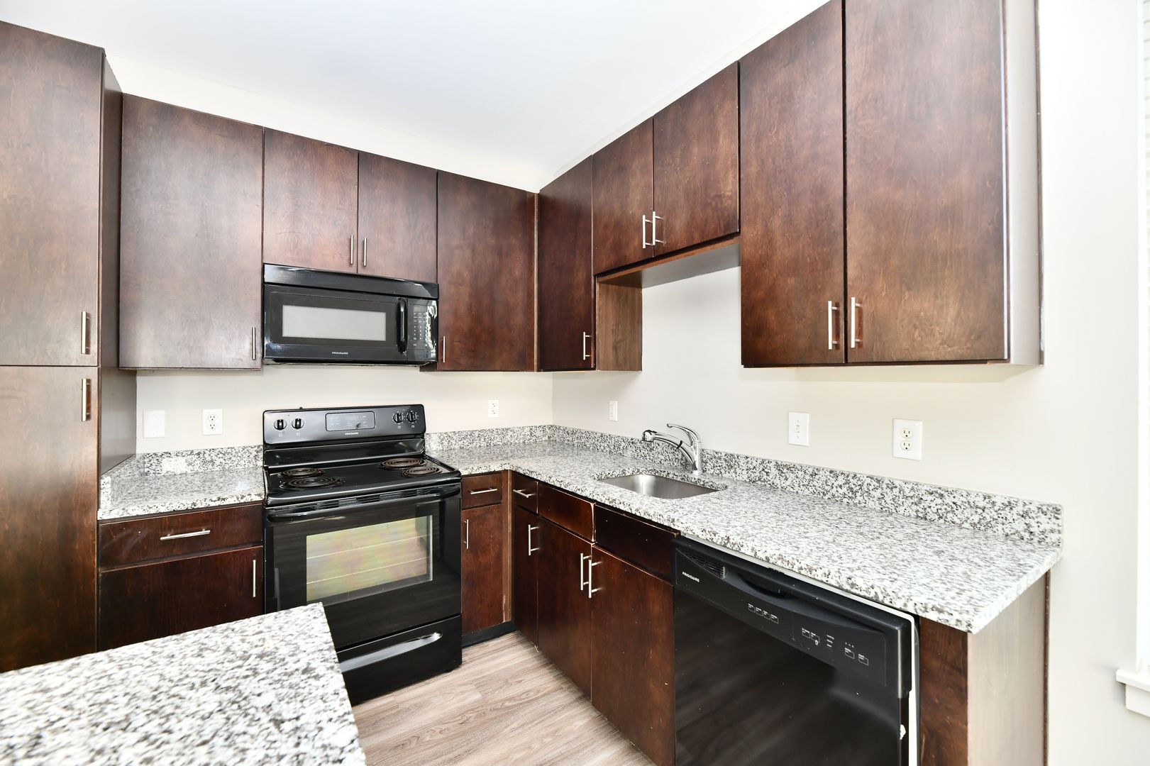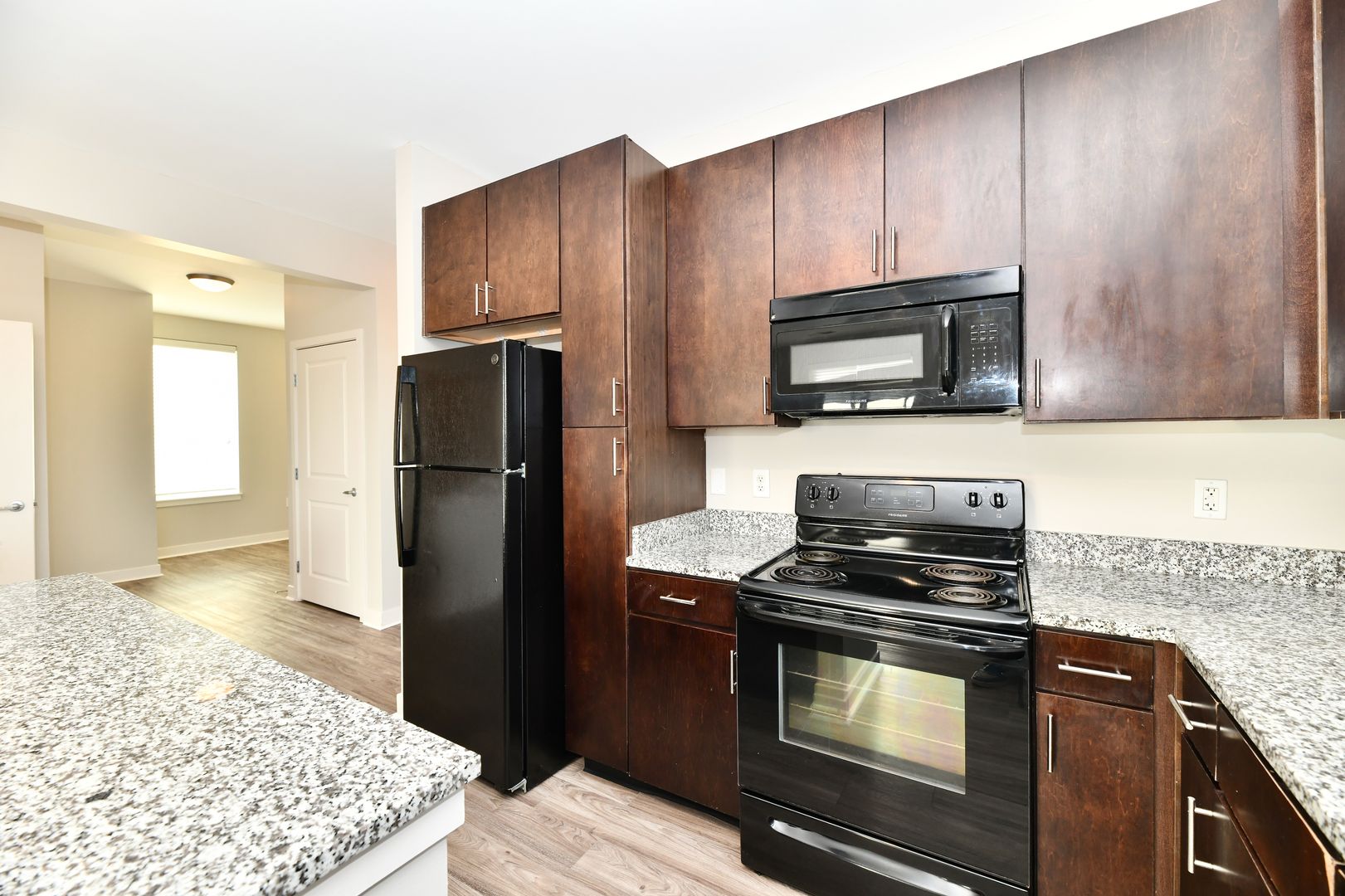 Inside, you’ll find an open-concept layout with large windows that flood the space with natural light. The modern kitchen features rich dark cabinetry, granite countertops, a spacious island ideal for entertaining, and sleek black appliances. Wood-style flooring throughout the main living area adds warmth and style, while the neutral color palette makes it easy to make the space your own.